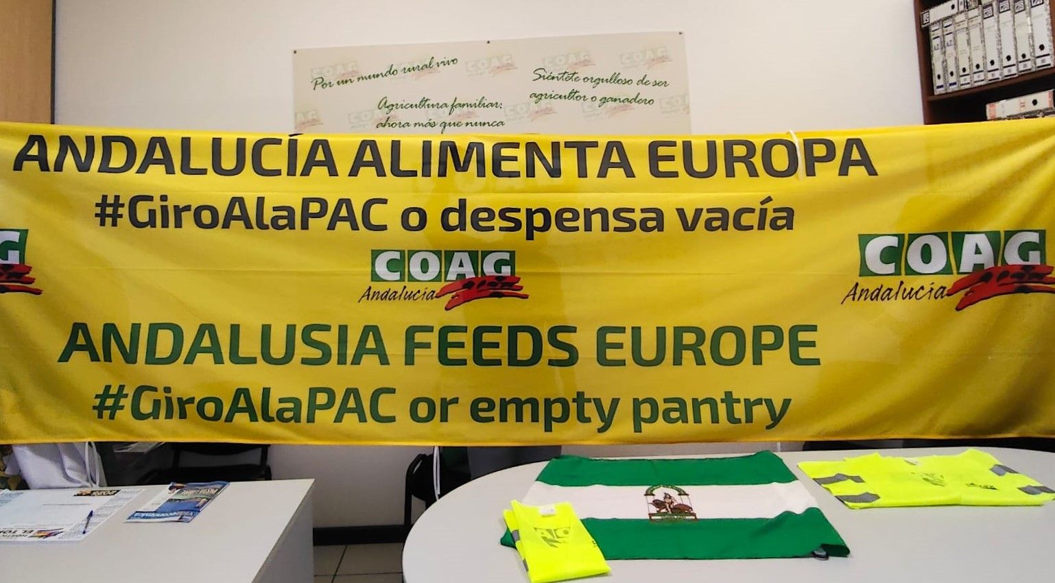 COAG Andalucía acudirá a esta cita con una pancarta de cinco metros de longitud en la que podrá leerse el lema “Andalucía alimenta a Europa. #GiroAlaPAC o despensa vacía”, acompañado de su traducción al inglés, como símbolo del papel estratégico que desempeña la agricultura andaluza en la seguridad alimentaria del conjunto de Europa.