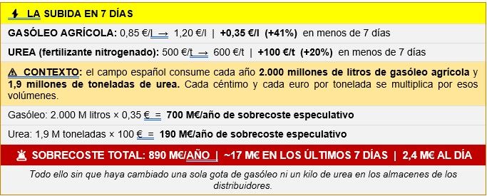 | ⚠ CONTEXTO: el campo español consume cada año 2.000 millones de litros de gasóleo agrícola y 1,9 millones de toneladas de urea. Cada céntimo y cada euro por tonelada se multiplica por esos volúmenes. |
