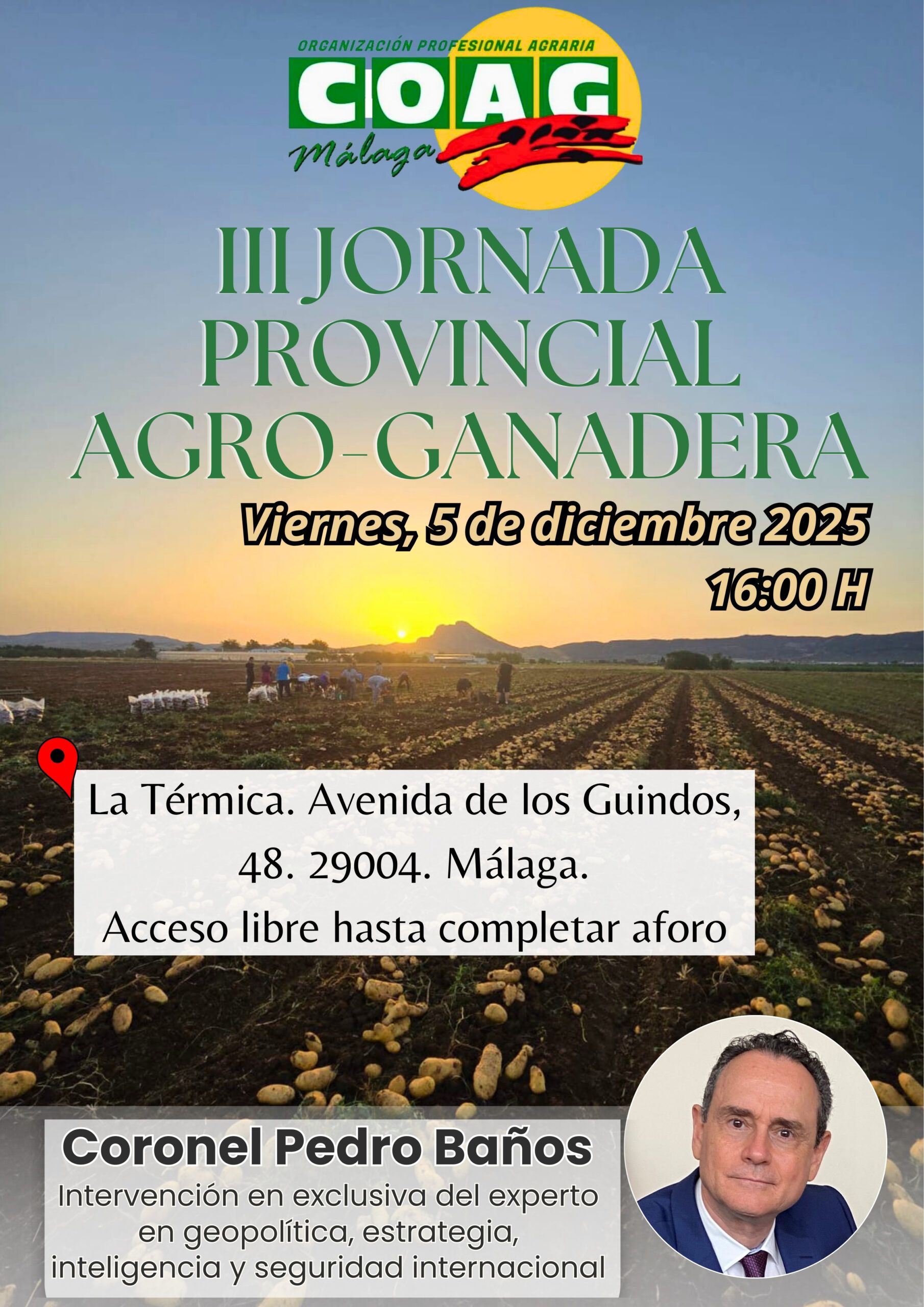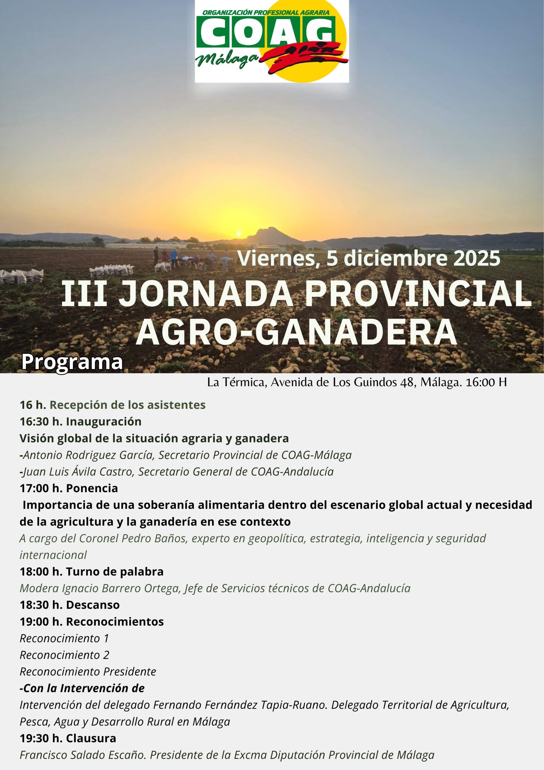 3 diciembre 2025.- Este viernes, 5 de diciembre, La Térmica (Málaga) acogerá la III Jornada Provincial Agro-Ganadera, organizada por COAG Málaga, un encuentro que se consolida como uno de los espacios de referencia para analizar el presente y futuro del campo malagueño. La cita comenzará a las 16:00 horas y contará con entrada libre y gratuita hasta completar aforo, con el objetivo de facilitar la asistencia de agricultores, ganaderos, profesionales del sector y toda aquella persona interesada en las distintas actividades previstas.